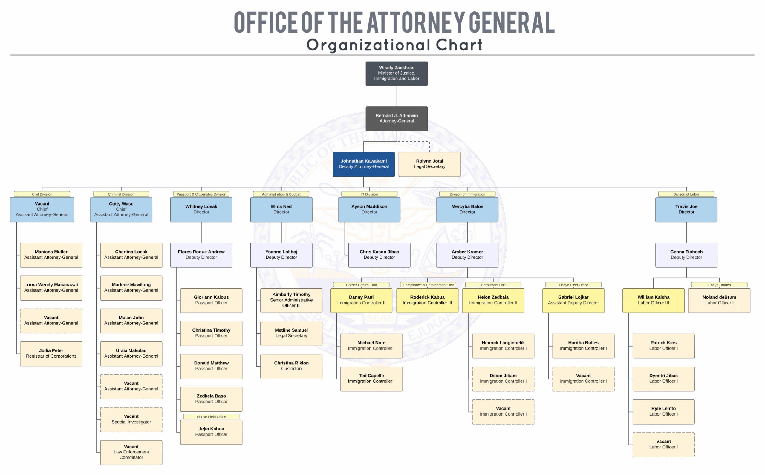" We are committed to providing accessible information about the responsibilities entrusted to the Office by the Constitution as well as other laws of the Republic of the Marshall Islands. The Office strives to enforce the Constitution and uphold the rule of law. By way of background, the Office advises on legal matters referred by the Cabinet, the President or Ministers... "